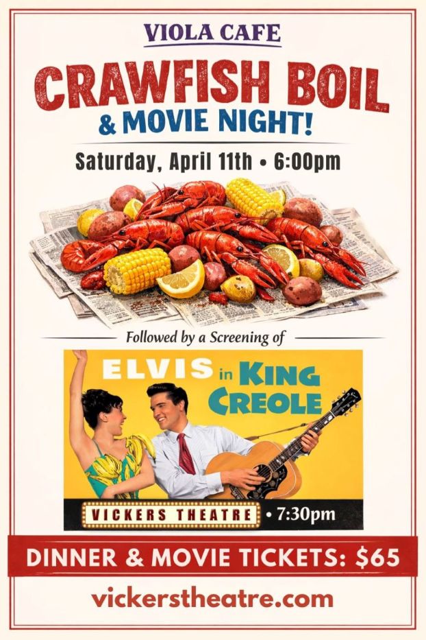 On April 11th at 6:00pm, Viola Cafe will host a traditional crawfish boil, followed by a 7:30pm screening of King Creole at the Vickers Theatre.